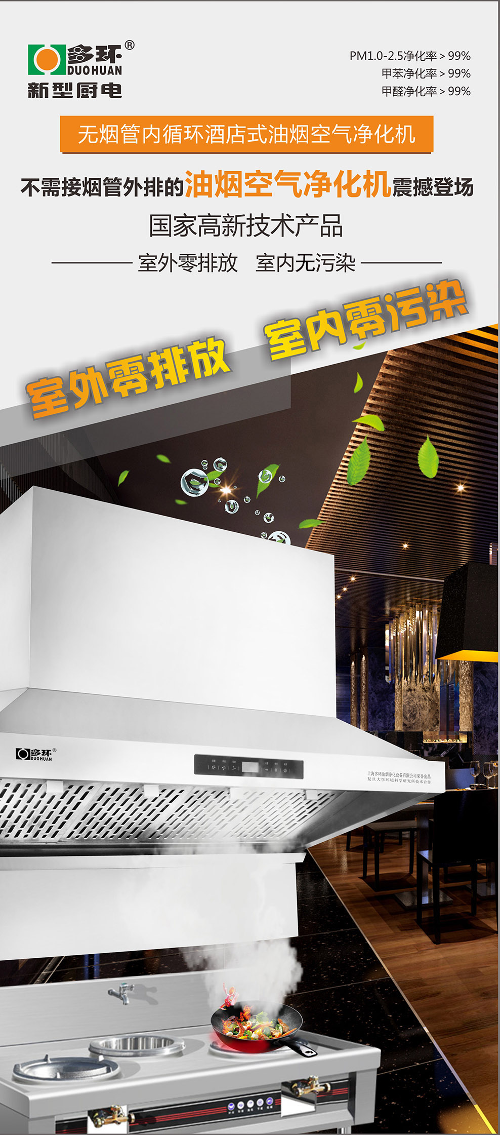 多環(huán)凈化設備公司研發(fā)生產(chǎn)的無管式內循環(huán)油煙凈化機是不用煙管對外排放的油煙凈化設備,采用吸排凈化一體機的形式將烹飪產(chǎn)生的油脂、煙顆粒物及有害氣體(醛、苯、VOCs等)、異味(辣、臭、酸味等)和有害細菌在室內進行凈化處理的廚電產(chǎn)品。(*數(shù)據(jù)來源于上海市環(huán)境保護產(chǎn)品質量監(jiān)督檢驗總站出具的《檢測報告》報告編號:2016|20-35-885523/2016|20-35-885524)